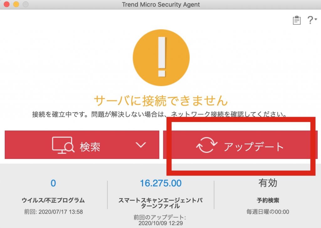 大学でインストールをしたウイルス対策ソフト(ApexOne、ウイルスバスターCorp.、Trend microsecurity for Mac)は定期的にアップデートを行ってください。