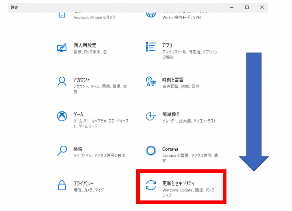 2 設定画面より下にスクロールし、「更新とセキュリティ」をクリック